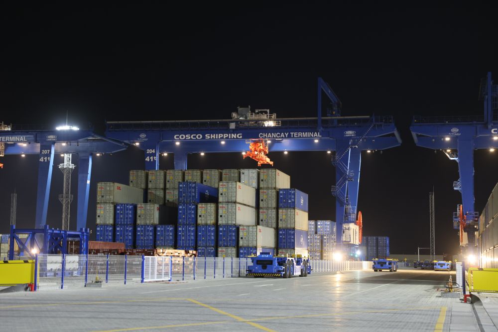 通過大屏幕連線,兩國元首共同下達開港指令。利馬以北80公里的錢凱港,在夜幕中開啟了港口作業(yè)。