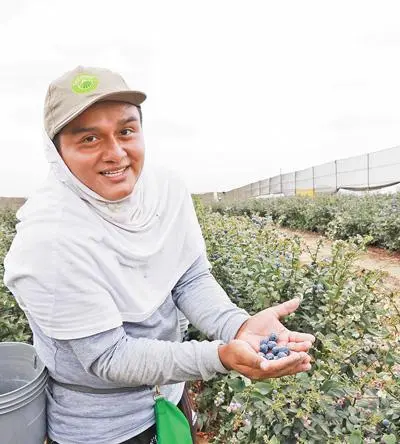 △在秘魯特魯希略市一家農(nóng)場(chǎng)里,采摘工人在展示剛摘下的藍(lán)莓。