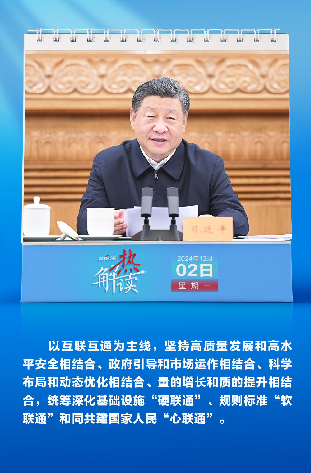 “統(tǒng)籌深化基礎(chǔ)設(shè)施‘硬聯(lián)通’、規(guī)則標準‘軟聯(lián)通’和同共建國家人民‘心聯(lián)通’”,“完善‘硬聯(lián)通’、‘軟聯(lián)通’、‘心聯(lián)通’協(xié)調(diào)推進機制”。12月2日,習近平總書記在第四次“一帶一路”建設(shè)工作座談會上對深化三個“聯(lián)通”再作部署。
