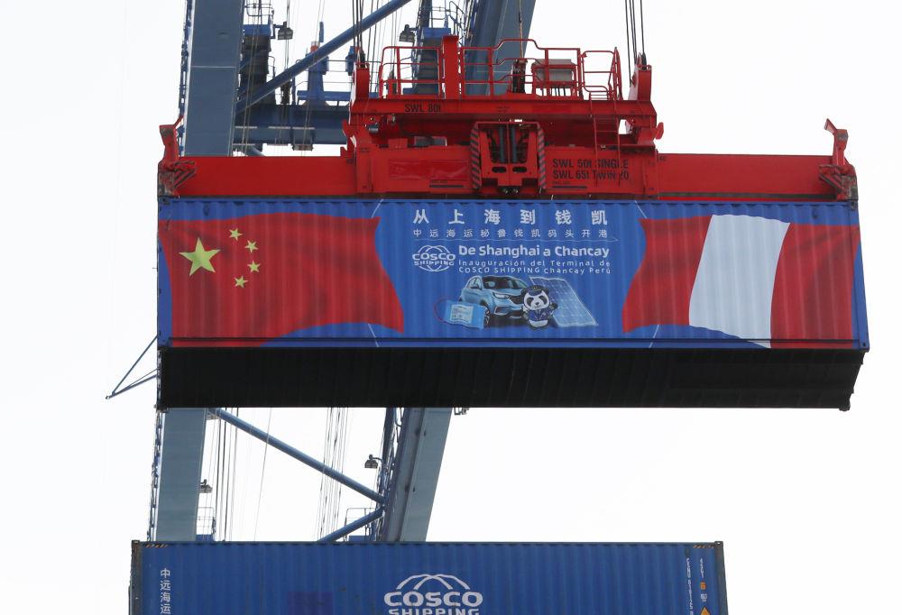 2024年11月14日,在秘魯首都利馬以北的錢凱港,岸邊智能化設(shè)備吊裝集裝箱。