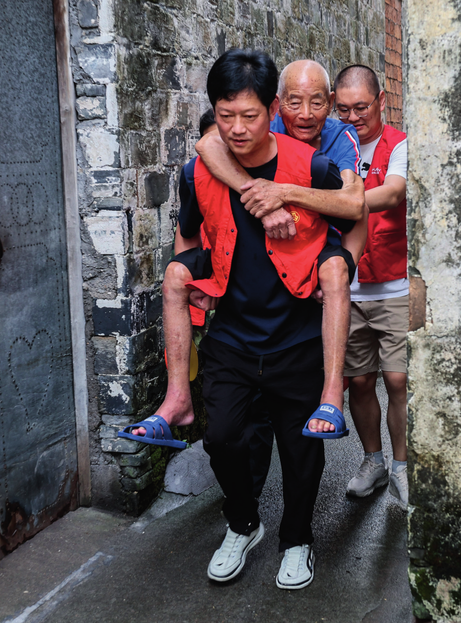 浙江省諸暨市趙家鎮(zhèn)泉畈村村干部和黨員志愿者在臺風來臨前轉(zhuǎn)移危舊房里的老人(2024年9月19日攝)徐昱 攝