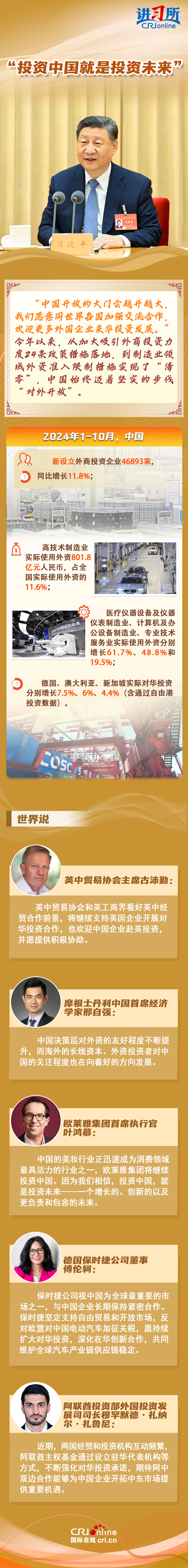 “中國(guó)是實(shí)干家、行動(dòng)派。”今年以來(lái),從習(xí)近平主席的歐洲之行到拉美之行,再到四天前在北京會(huì)見(jiàn)主要國(guó)際經(jīng)濟(jì)組織負(fù)責(zé)人,習(xí)近平一直強(qiáng)調(diào),中國(guó)的發(fā)展將給世界帶來(lái)巨大機(jī)遇。據(jù)聯(lián)合國(guó)貿(mào)易和發(fā)展會(huì)議不久前發(fā)布的《世界投資報(bào)告2024》中文版顯示,中國(guó)吸引外資的結(jié)構(gòu)不斷優(yōu)化、質(zhì)量不斷提高,多位政商界人士也認(rèn)為中國(guó)是一個(gè)非常有前景的市場(chǎng),投資中國(guó)就是投資未來(lái)。