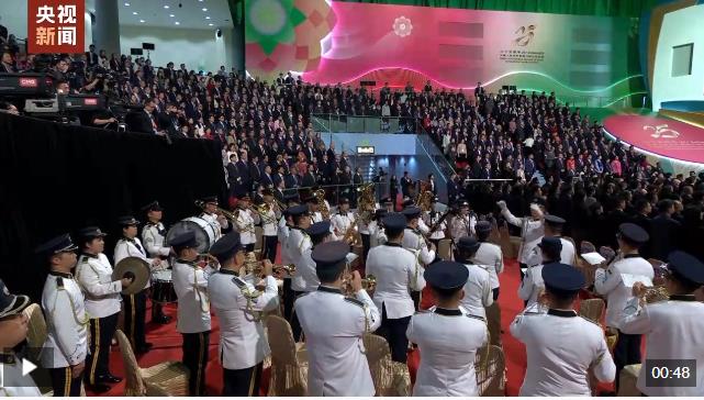 慶祝澳門(mén)回歸祖國(guó)25周年大會(huì)暨澳門(mén)特別行政區(qū)第六屆政府就職典禮20日上午在澳門(mén)東亞運(yùn)動(dòng)會(huì)體育館隆重舉行,現(xiàn)場(chǎng)全體起立,奏唱國(guó)歌。