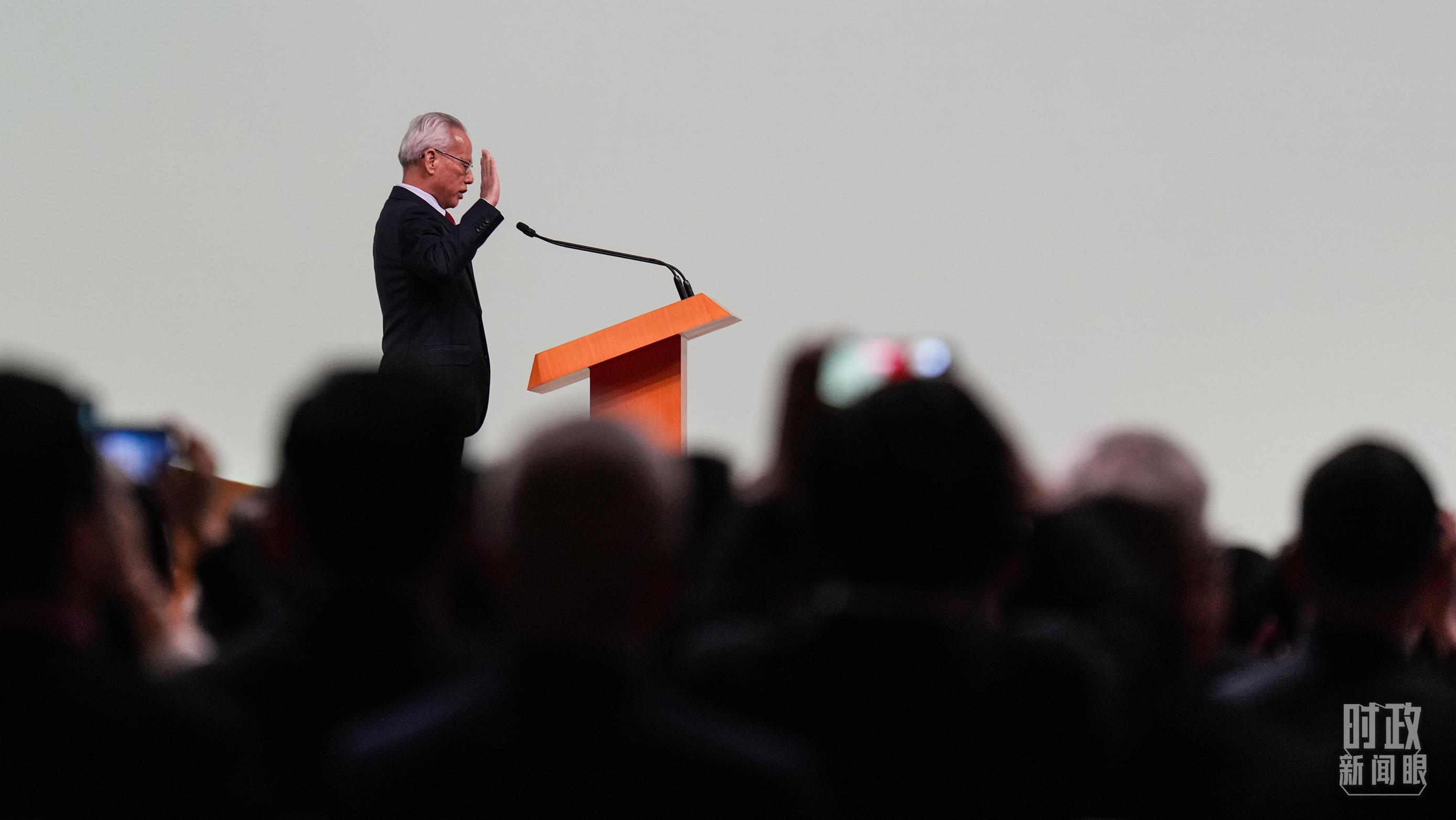 澳門(mén)特區(qū)第六任行政長(zhǎng)官岑浩輝莊嚴(yán)宣誓。(總臺(tái)記者李晉拍攝)