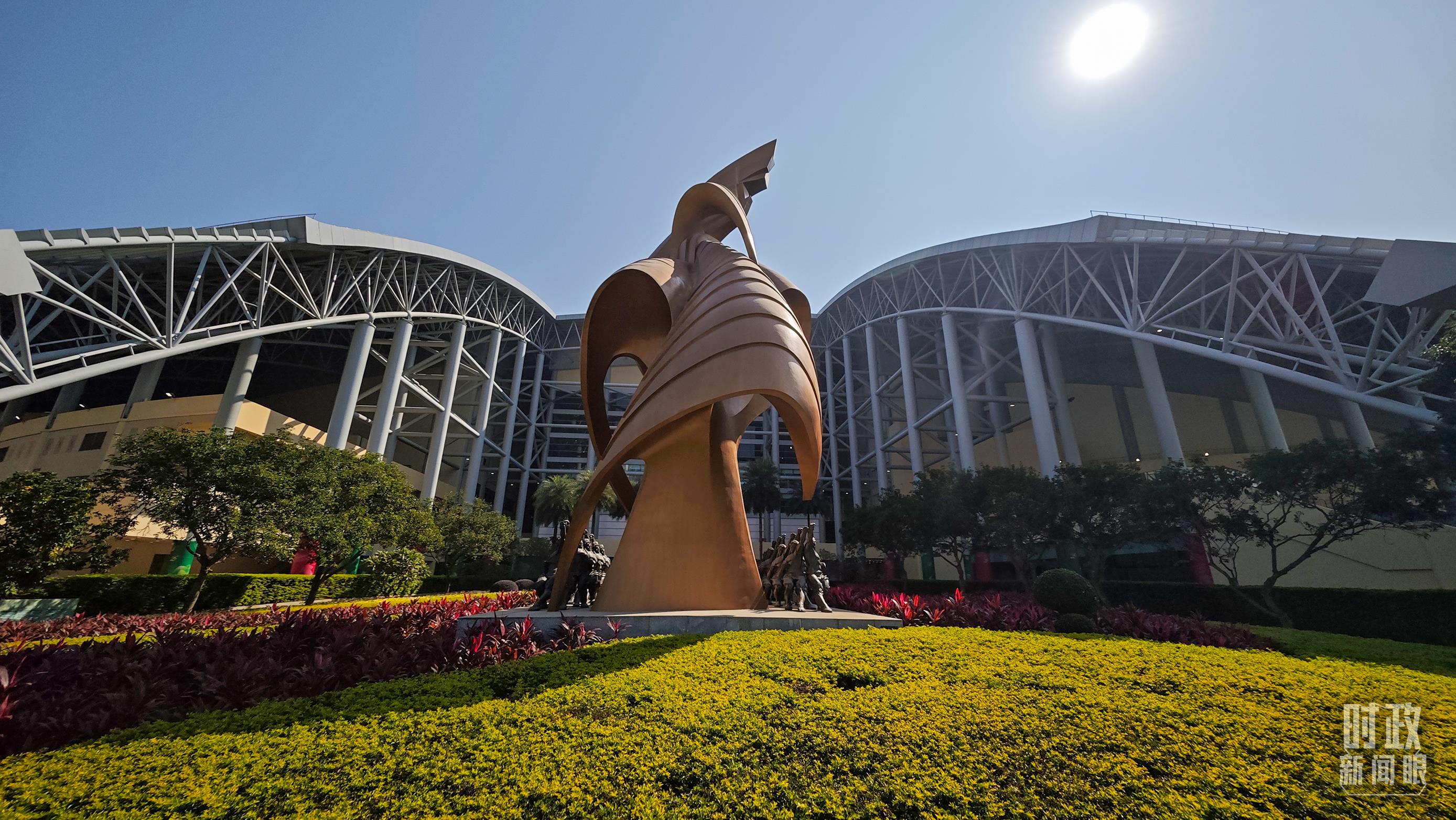 澳門(mén)東亞運(yùn)動(dòng)會(huì)體育館前,名為“揚(yáng)帆”的巨型雕塑熠熠生輝。(總臺(tái)央視記者彭漢明拍攝)