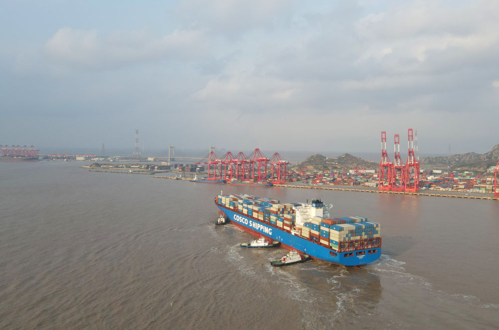 “新上?!陛喌诌_洋山港,這是自秘魯錢凱港開港后首個“錢凱—上海”正式航次(2024年12月18日攝,無人機照片)。新華社記者 方喆 攝