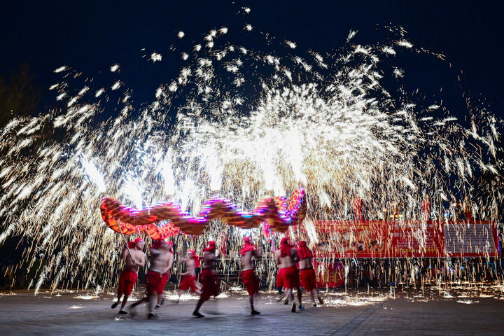 民間藝人在河南省洛陽市2024隋唐河洛文化廟會(huì)上表演打鐵花(2024年2月14日攝)。新華社發(fā)(李衛(wèi)超攝)