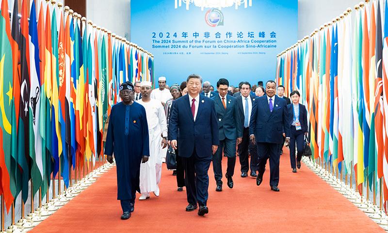 △2024年9月5日,習近平主席在北京人民大會堂出席中非合作論壇北京峰會開幕式并發(fā)表主旨講話。這是習主席同外方領(lǐng)導人共同步入會場。