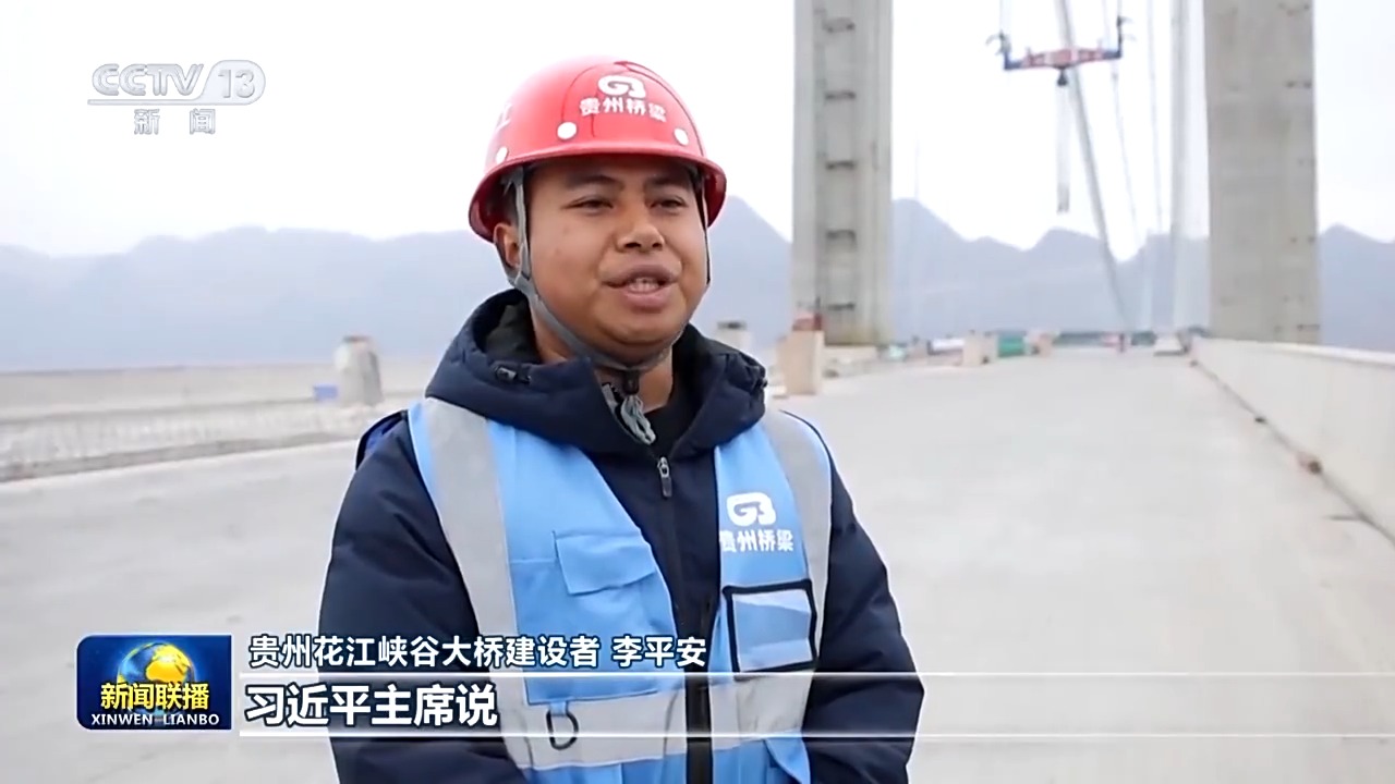 貴州花江峽谷大橋建設(shè)者 李平安:習(xí)近平主席說(shuō),新征程上,每一個(gè)人都是主角。我覺(jué)得非常自豪,心里也感到非常溫暖。我們正在建設(shè)的花江峽谷大橋春節(jié)前后即將合龍,將是世界第一高橋。我們一定會(huì)認(rèn)真細(xì)致,高質(zhì)量地完成工程任務(wù),把中國(guó)式現(xiàn)代化的美好愿景,書(shū)寫(xiě)在祖國(guó)的山川河流之間。