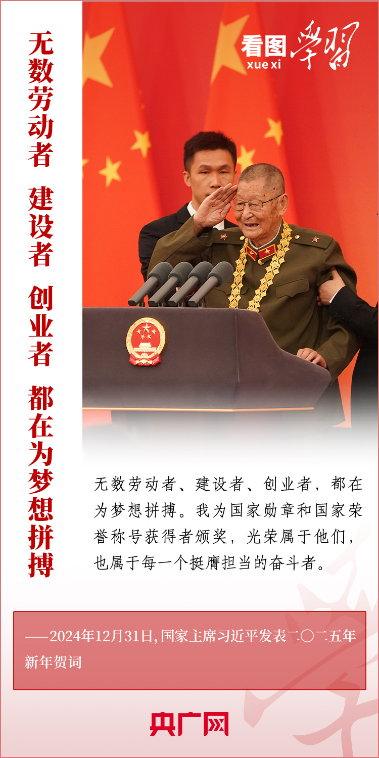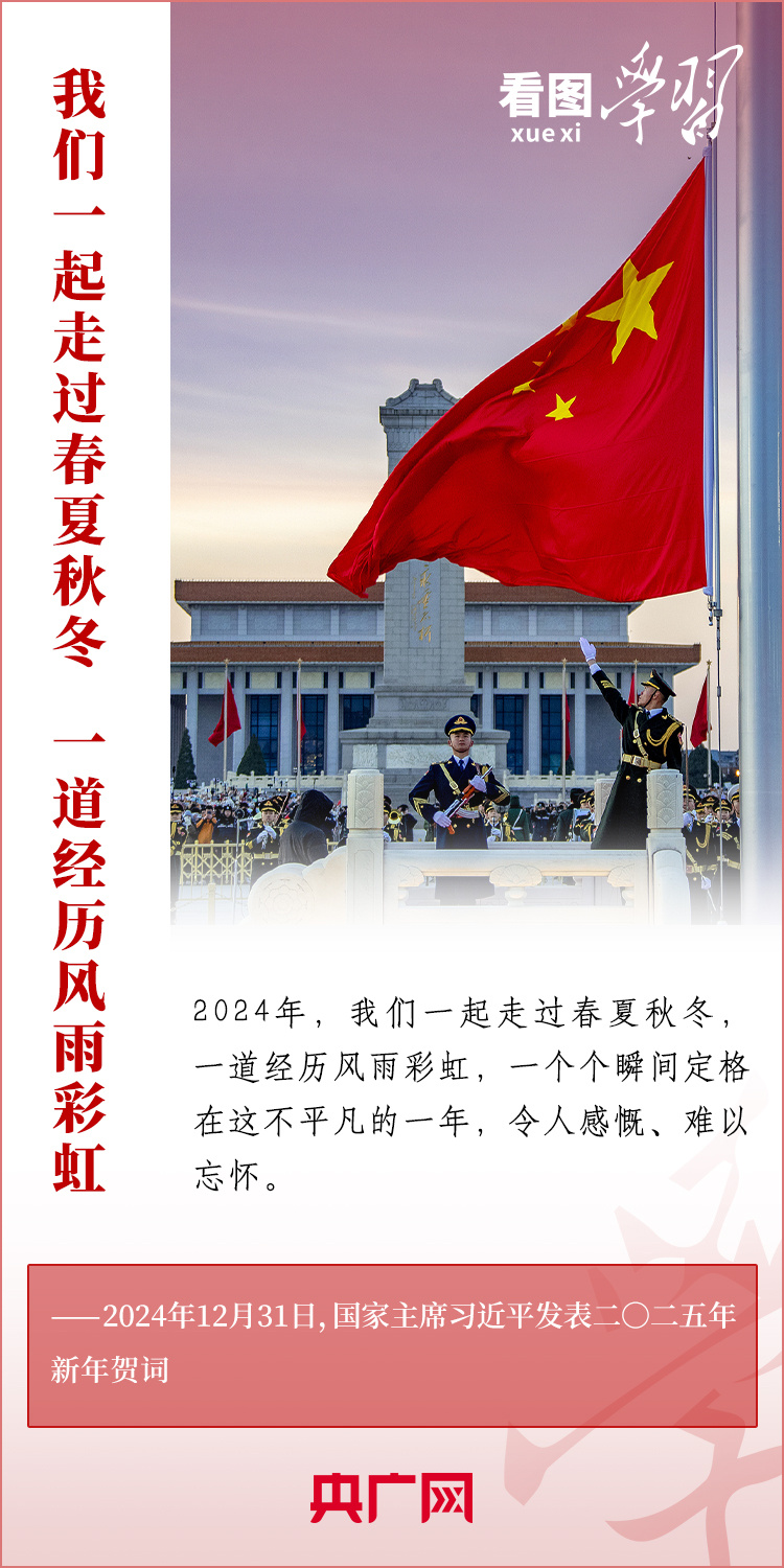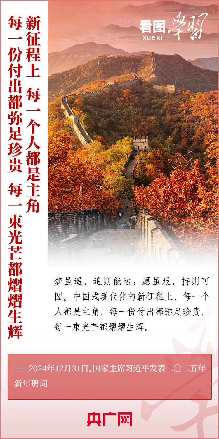 “夢(mèng)雖遙,追則能達(dá);愿雖艱,持則可圓?!毙履昵跋?,習(xí)近平主席發(fā)表二〇二五年新年賀詞。在溫暖有力的講述中,習(xí)主席深情回望過(guò)去一年中國(guó)不平凡的奮斗歷程、精彩瞬間,感慨大家一道經(jīng)歷的風(fēng)雨彩虹、難忘時(shí)刻,贊美無(wú)數(shù)為夢(mèng)想拼搏的勞動(dòng)者、建設(shè)者、創(chuàng)業(yè)者。習(xí)主席說(shuō),中國(guó)式現(xiàn)代化的新征程上,每一個(gè)人都是主角,每一份付出都彌足珍貴,每一束光芒都熠熠生輝。讓我們充滿(mǎn)信心,在新的一年接續(xù)奮斗!