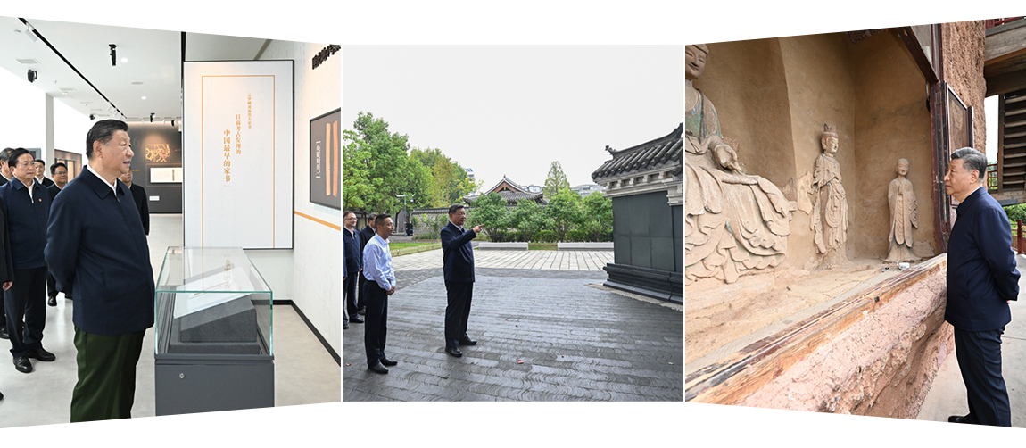 自左向右分別為:2024年11月4日,習(xí)近平總書記在湖北孝感云夢縣博物館參觀出土秦漢簡牘展;2024年10月17日,習(xí)近平總書記在安徽桐城六尺巷考察;2024年9月11日,習(xí)近平總書記在甘肅天水麥積山石窟考察。