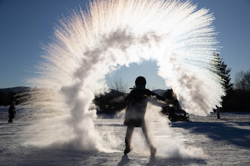 游客在黑龍江漠河市北極村體驗“潑水成冰”。