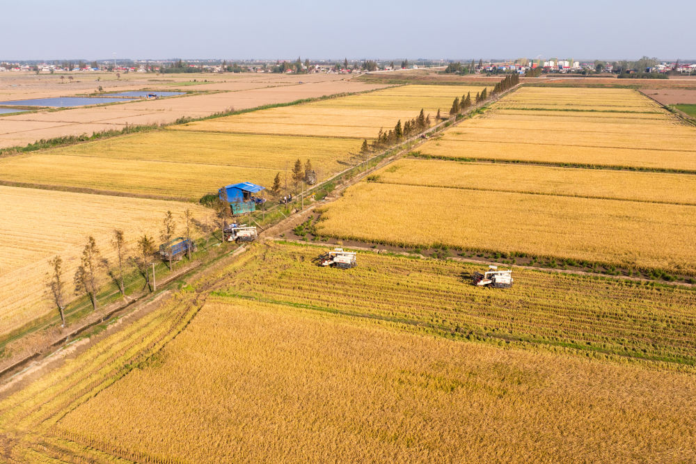 2024年11月1日,在湖南華容縣團(tuán)洲垸,村民駕駛收割機(jī)收獲水稻(無(wú)人機(jī)照片)。新華社記者陳思汗 攝