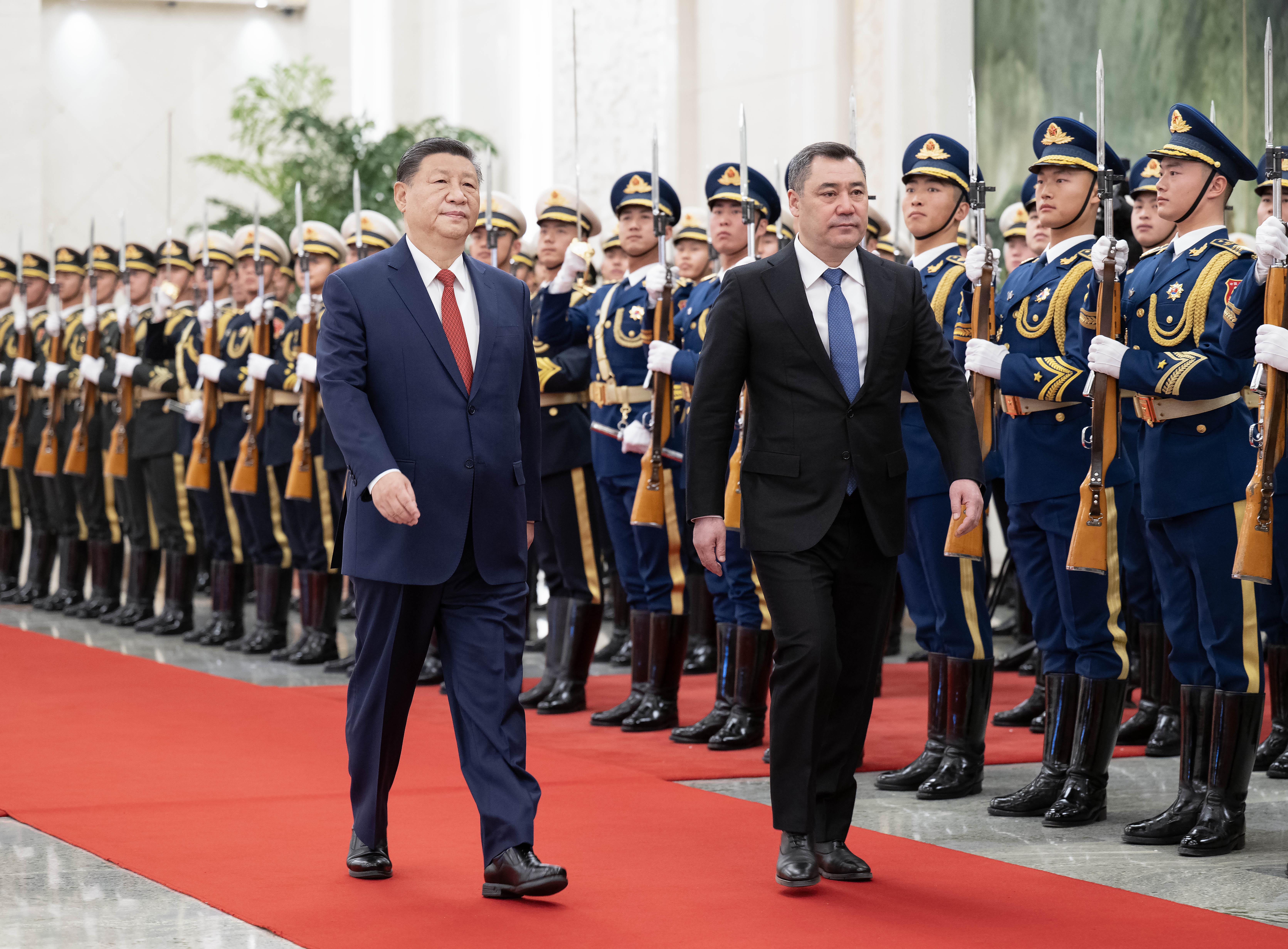 天安門廣場鳴放21響禮炮,禮兵列隊(duì)致敬。兩國元首登上檢閱臺(tái),軍樂團(tuán)奏中吉兩國國歌。扎帕羅夫在習(xí)近平陪同下檢閱中國人民解放軍儀仗隊(duì),并觀看分列式。