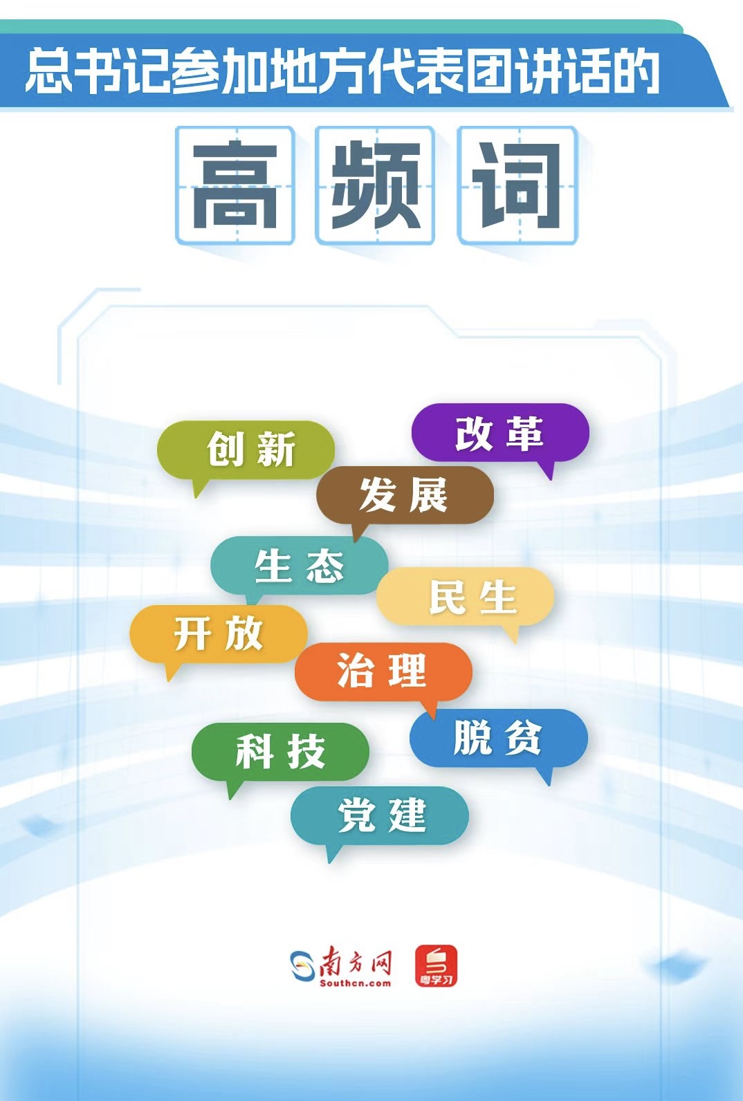 13年36次參加地方代表團審議,習近平總書記的講話里,有哪些高頻詞?從詞云圖中,“創(chuàng)新”“改革”“發(fā)展”“生態(tài)”“民生”“開放”“治理”“脫貧”“科技”“黨建”等詞語引人注目,反映了總書記的關注點。