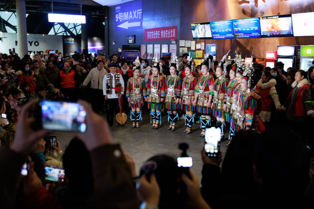 2025年2月25日,電影《哪吒2》上映期間,演員在貴州貴陽(yáng)一家影城表演侗族大歌。