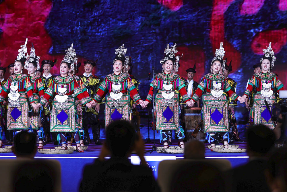 2023年7月9日,演員在2023年生態(tài)文明貴陽(yáng)國(guó)際論壇閉幕式上演唱侗族大歌。