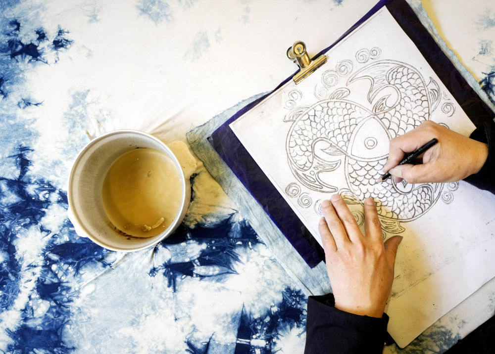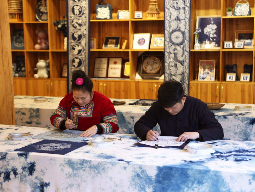 2025年3月14日,村民在肇興侗寨內(nèi)制作蠟染。近年來(lái),當(dāng)?shù)丶哟髮?duì)少數(shù)民族非遺文創(chuàng)產(chǎn)品的研發(fā)和創(chuàng)新力度,同時(shí)進(jìn)一步加強(qiáng)線(xiàn)上銷(xiāo)售,通過(guò)微信、網(wǎng)上直播、網(wǎng)店等方式進(jìn)行帶貨,讓當(dāng)?shù)厝罕娡ㄟ^(guò)指尖增收致富。