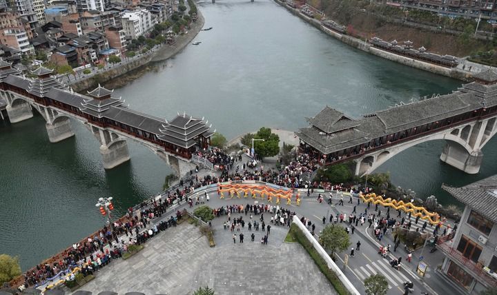 2024年2月22日,在貴州省黔東南苗族侗族自治州錦屏縣,舞龍隊(duì)經(jīng)過(guò)兩座風(fēng)雨橋的交匯處。風(fēng)雨橋,又稱(chēng)“花橋”,是侗族的標(biāo)志性建筑之一。因橋上建有廊和亭,既可行人又可遮蔽風(fēng)雨,故稱(chēng)風(fēng)雨橋。其以木為料、以榫銜接,是侗族橋梁建筑藝術(shù)的結(jié)晶。鼓樓、花橋的侗族木構(gòu)建筑營(yíng)造技藝被列入國(guó)家級(jí)非物質(zhì)文化遺產(chǎn)代表性項(xiàng)目。