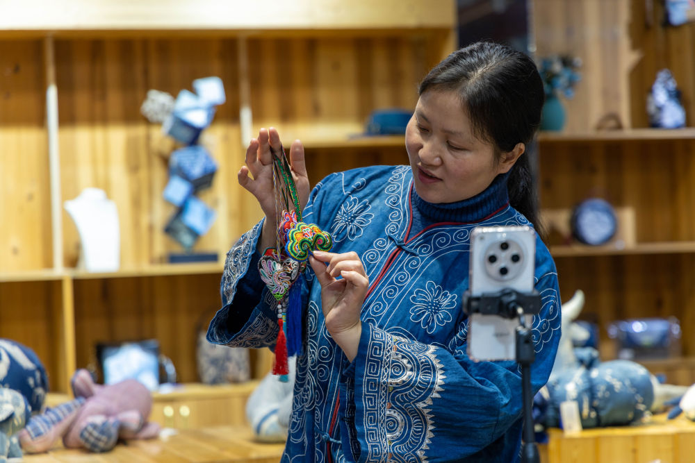 2025年3月14日,村民在肇興侗寨內(nèi)通過(guò)手機(jī)直播銷(xiāo)售刺繡作品。侗繡承載著侗族人的信仰與記憶,年輕繡娘的手藝多半來(lái)自母親傳承,侗族婦女用一針一線(xiàn)將民族古老的神話(huà)傳說(shuō)、歷史風(fēng)俗記錄在服飾的紋樣里,讓這門(mén)手藝在侗鄉(xiāng)世代傳承。2011年,侗族刺繡被列入國(guó)家級(jí)非物質(zhì)文化遺產(chǎn)名錄。