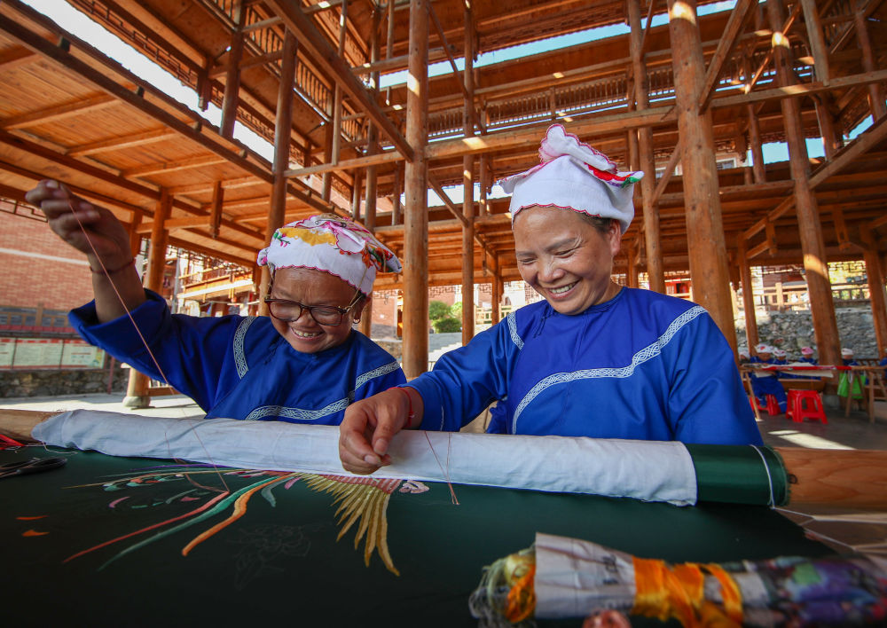 2021年9月27日,貴州省鎮(zhèn)遠(yuǎn)縣報(bào)京鄉(xiāng)報(bào)京村村民邰木香(右)在制作侗繡。邰木香將侗族的民間故事以刺繡形式展現(xiàn)出來(lái),還先后開(kāi)發(fā)出傳統(tǒng)與現(xiàn)代相結(jié)合的侗族服飾、工藝包、繡花鞋、圍腰、頭巾、枕巾等系列產(chǎn)品,深受?chē)?guó)內(nèi)外客商的青睞,致富的同時(shí)帶動(dòng)當(dāng)?shù)?00多名繡娘實(shí)現(xiàn)就業(yè)增收。