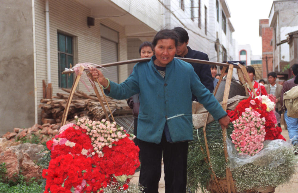 云南省昆明市呈貢龍街鄉(xiāng)斗南村是中國有名的“花鄉(xiāng)”,全村幾乎家家種花。這是一位當?shù)鼗ㄞr挑著一擔鮮花去花卉交易市場出售(1999年6月2日發(fā))。