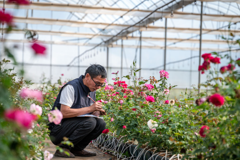 2023年10月20日,在云南省安寧市現(xiàn)代農業(yè)園區(qū)玫瑰種植示范園,技術員田連通在記錄太空育種玫瑰花編號。