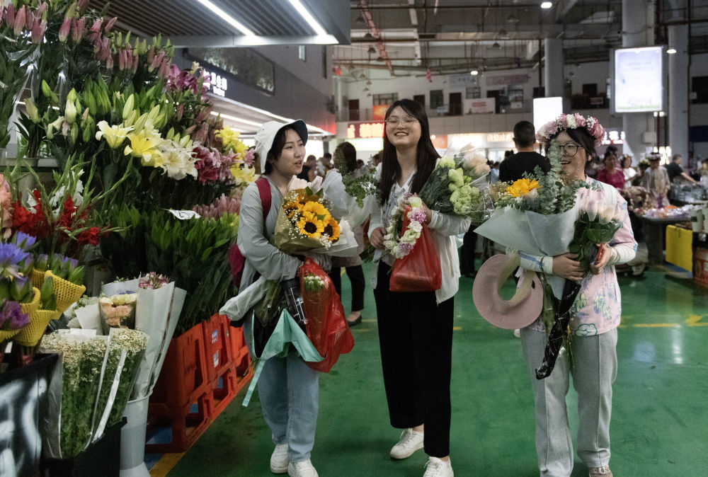 2023年7月13日,游客在昆明斗南花卉市場內購買鮮花。