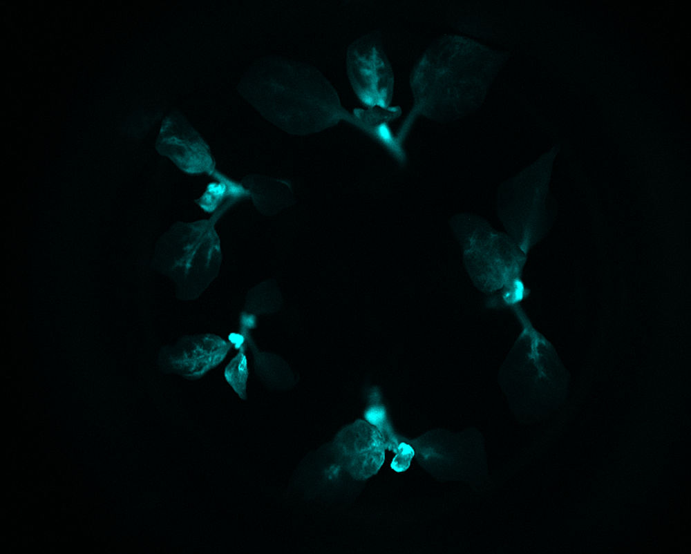 這是云南某農業(yè)研發(fā)團隊利用基因技術成功培育出肉眼可見的“自發(fā)光植物”在黑暗條件下發(fā)光(2017年6月21日攝)。