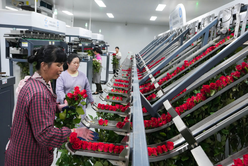 2024年8月23日,在云南晉寧花卉產(chǎn)業(yè)現(xiàn)代化示范園采后處理中心,花農將鮮切花自動分揀流水線上分揀好的鮮花取下,準備放入包裝流水線。