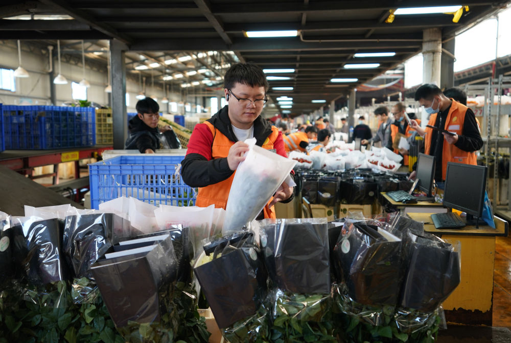 2022年11月11日,工作人員在昆明斗南花市給鮮花貼標簽。快遞物流時效不斷優(yōu)化、冷鏈運輸技術持續(xù)提升,也為中國鮮花加速“出海”保駕護航。