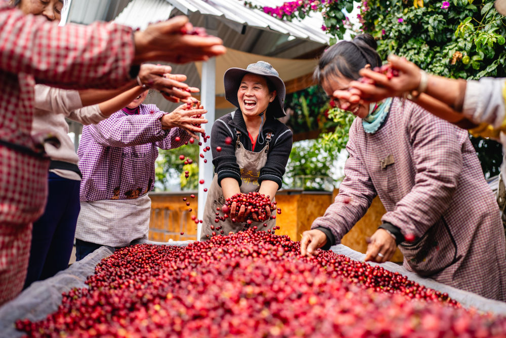 在云南省普洱市思茅區(qū)天玉咖啡莊園,人們?cè)趹c祝今年咖啡豐收(2025年1月8日攝)。新華社記者 胡超 攝