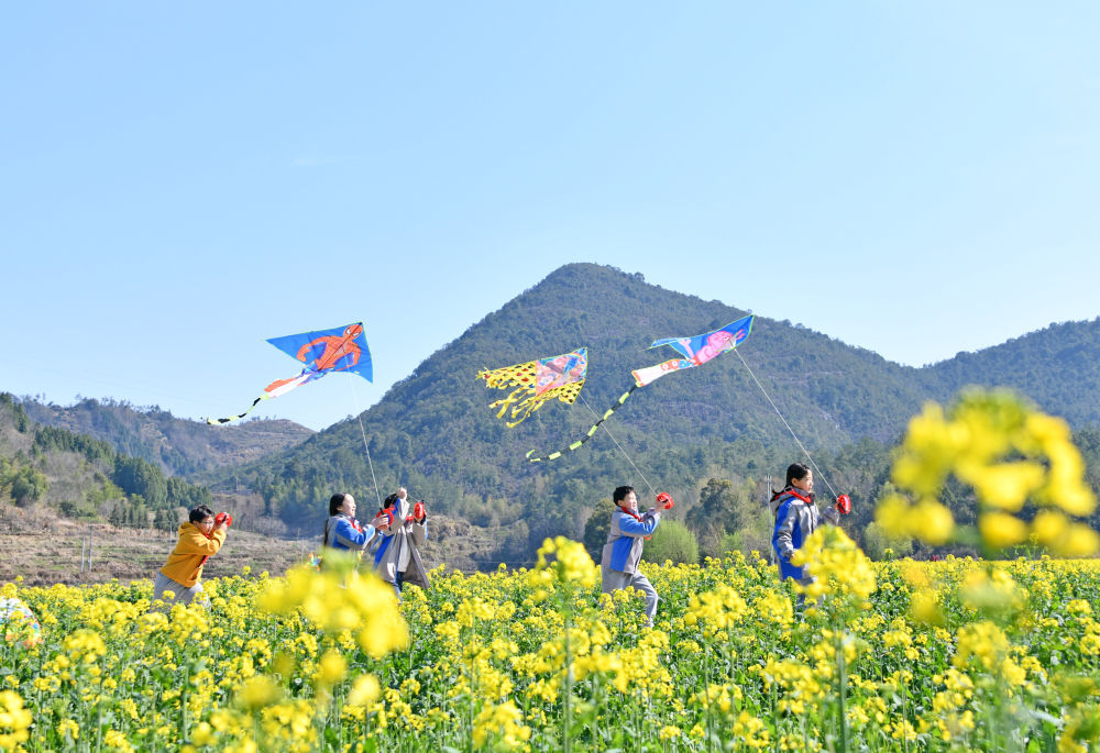 2025年3月17日,浙江省臺(tái)州市仙居縣雙廟鄉(xiāng)中心小學(xué)學(xué)生在油菜花叢中放風(fēng)箏。新華社發(fā)(王華斌 攝)
