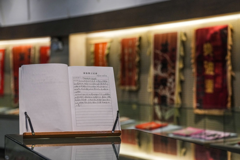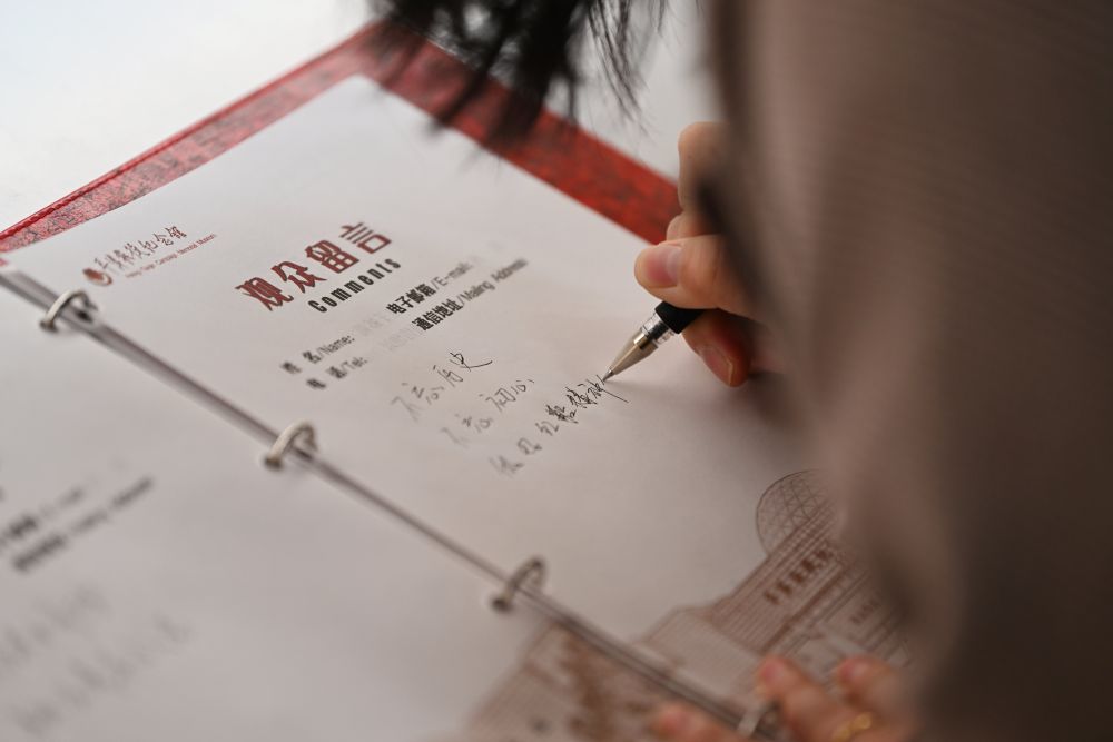 2025年3月31日,參觀者在江蘇省徐州市淮海戰(zhàn)役紀念館留言簿上留言。