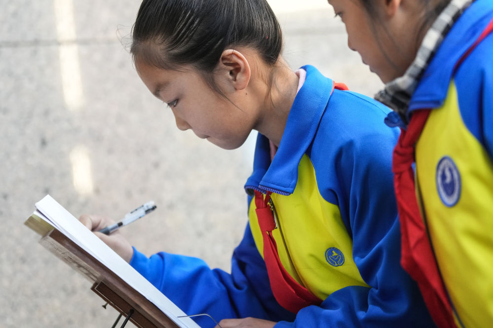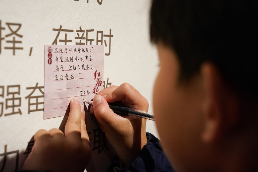 2025年3月27日,安徽省合肥市金斗路小學的學生在渡江戰(zhàn)役紀念館書寫留言卡。