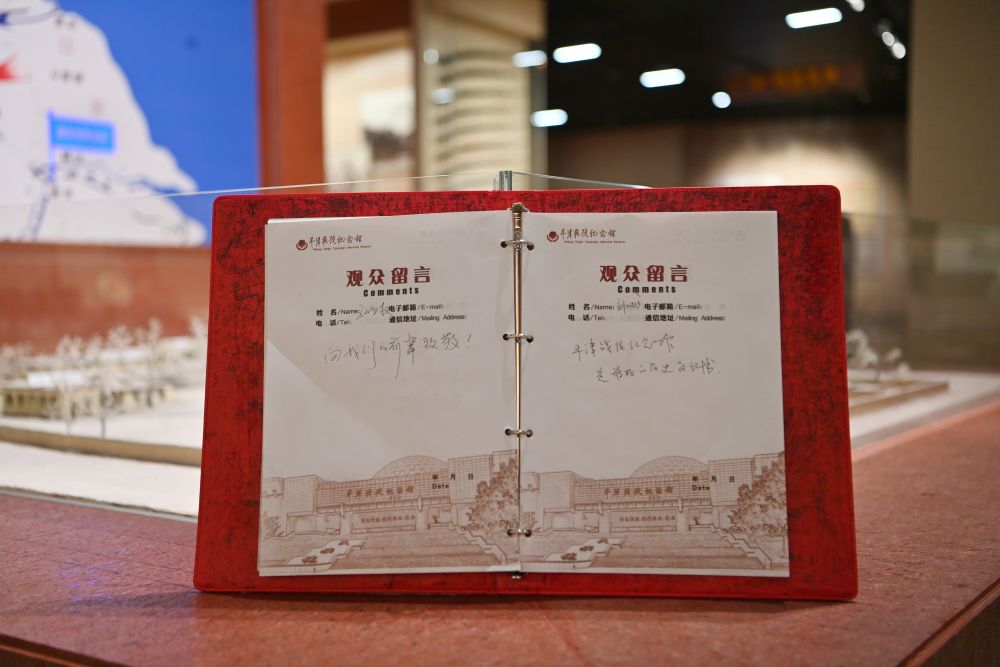 這是2025年3月27日拍攝的平津戰(zhàn)役紀念館觀眾留言簿。一名觀眾寫下“向我們的前輩致敬!”