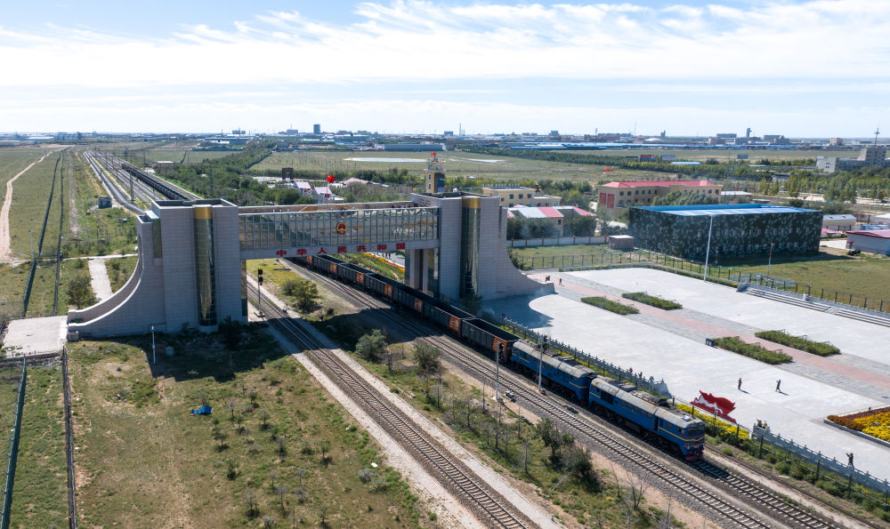 2024年8月20日,中歐班列在內(nèi)蒙古滿洲里口岸準備出境(無人機照片)。滿洲里口岸位于中俄蒙三國交界處,是中國最大的陸路口岸,也是連接俄羅斯、蒙古國的重要樞紐。2024年,滿洲里口岸中歐班列通行量突破4000列,為推進高質(zhì)量共建“一帶一路”注入新動能。