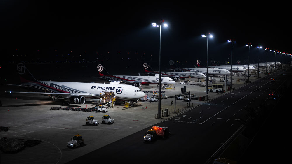 2024年5月25日凌晨,工人在湖北鄂州花湖國際機場停機坪裝卸貨物。鄂州花湖國際機場于2022年7月建成投運,是亞洲首個專業(yè)貨運樞紐機場。截至2025年1月26日,鄂州花湖國際機場已開通37條國際貨運航線和66條國內(nèi)貨運航線。