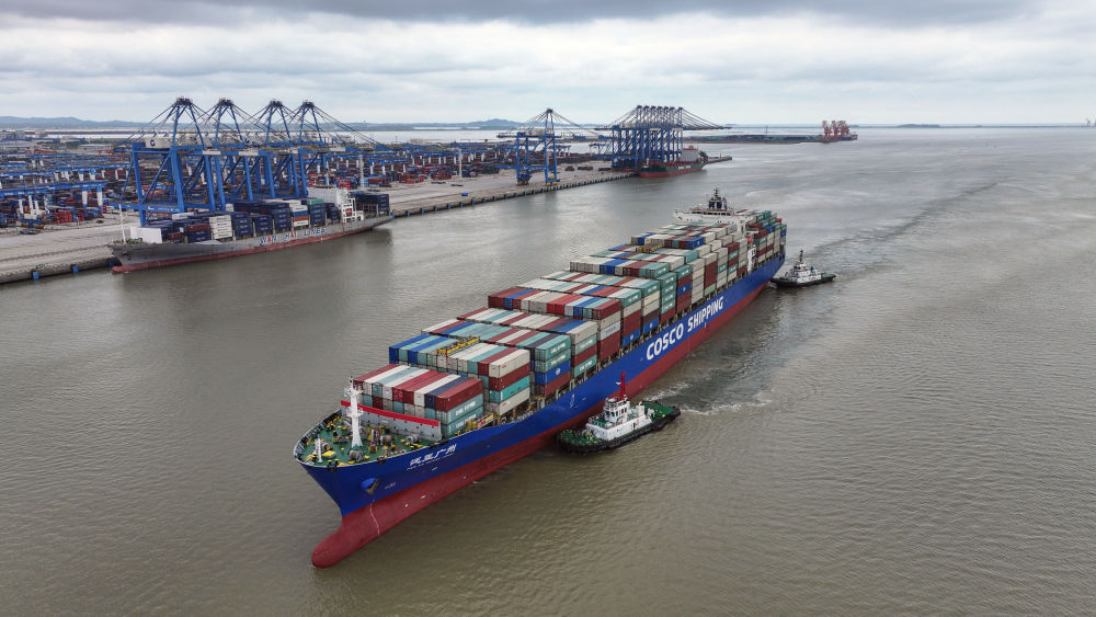 2024年5月19日,一艘海輪在廣西欽州港碼頭靠泊(無人機照片)。欽州港是北部灣港的組成部分,也是中國西南地區(qū)通往東盟的重要出???。西部陸海新通道利用鐵路、公路、水運等多種運輸方式,由重慶一路向南,經(jīng)廣西北部灣出海通達世界各地。截至2025年1月1日,北部灣港總航線達80條,其中外貿(mào)航線49條,基本實現(xiàn)國內(nèi)主要港口和東南亞、東北亞主要港口全覆蓋。