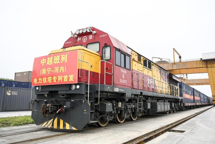 2024年3月8日,在廣西南寧國(guó)際鐵路港,電力鐵塔專列準(zhǔn)備發(fā)車。當(dāng)日,一列滿載340噸電力鐵塔的中越班列從南寧國(guó)際鐵路港開(kāi)出,發(fā)往越南河內(nèi)。新華社記者 曹祎銘 攝