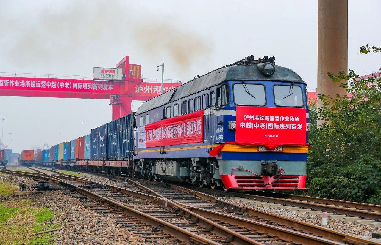 2024年12月18日,四川瀘州首列中越(中老)國際班列,從瀘州港國際集裝箱碼頭進(jìn)港鐵路專線緩緩駛出。