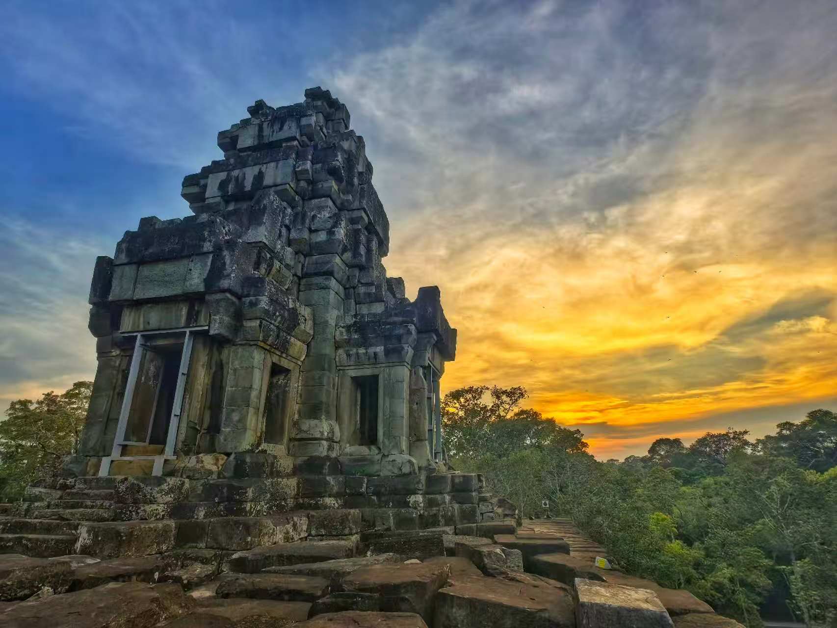 位于柬埔寨暹粒省的吳哥古跡坐落在一片密林之中。傍晚,一縷夕陽照射在茶膠寺高聳的砂巖塔上,為這座千年古寺籠罩上了一層柔和的金光。“Hello Bong(你好,大哥)!”記者向管理員打招呼。“你好!”管理員用中文回復(fù)道。
