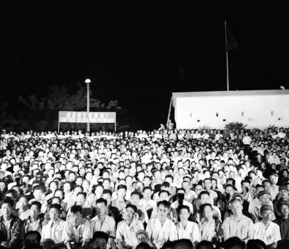 1959年12月,來自越南的客人在兩國邊境居民慶祝共建水利工程完工聯(lián)歡會上觀看演出。
