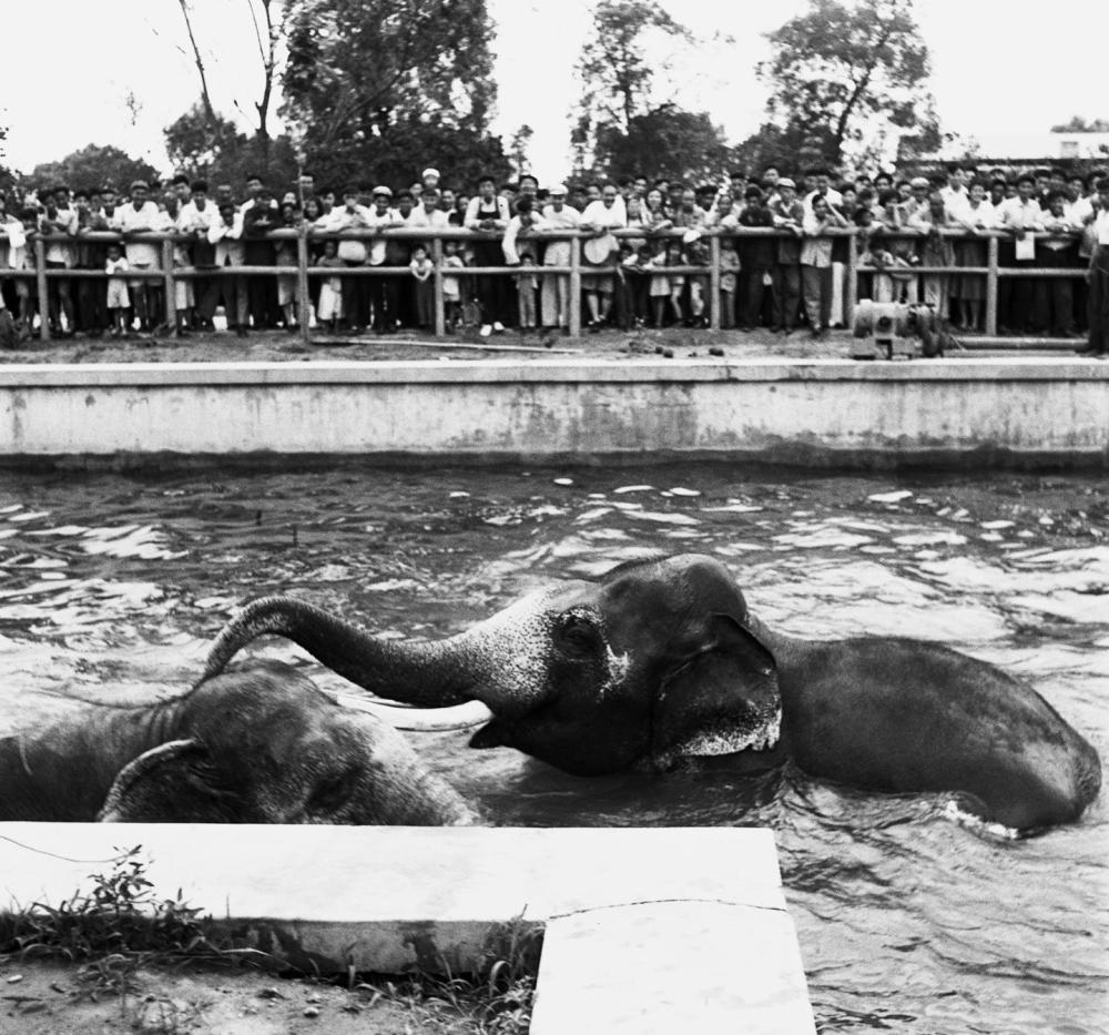 1954年7月,觀眾在北京西郊公園動物園觀看越南等國家贈送的大象。