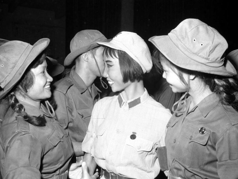 1967年6月30日,越南南方解放軍歌舞團的演員在北京觀看芭蕾舞劇《紅色娘子軍》。這是中越兩國演員在一起交談。