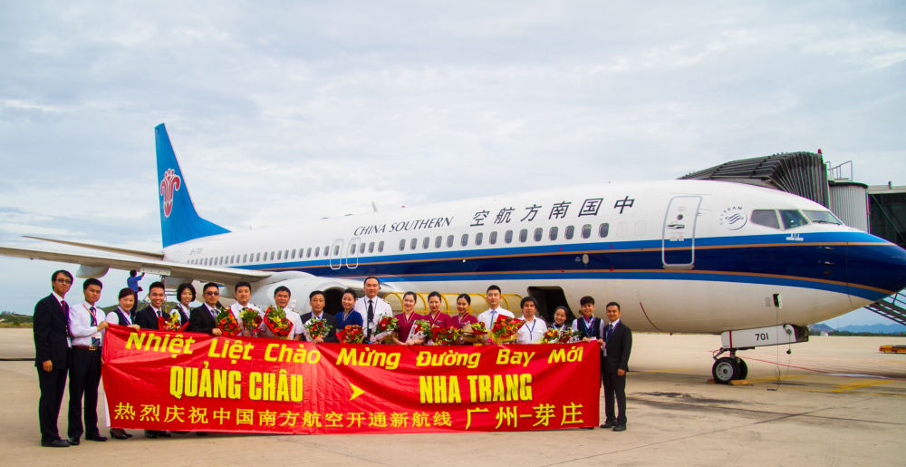 2015年6月20日,中國南航廣州至越南芽莊首航成功,機組人員在抵達越南金蘭國際機場后合影。