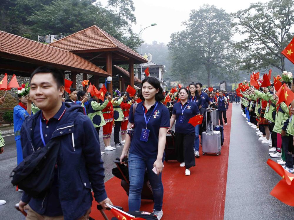 2016年11月7日,在越南北部諒山省,人們歡迎中國青年代表參加第三屆中越青年大聯(lián)歡。