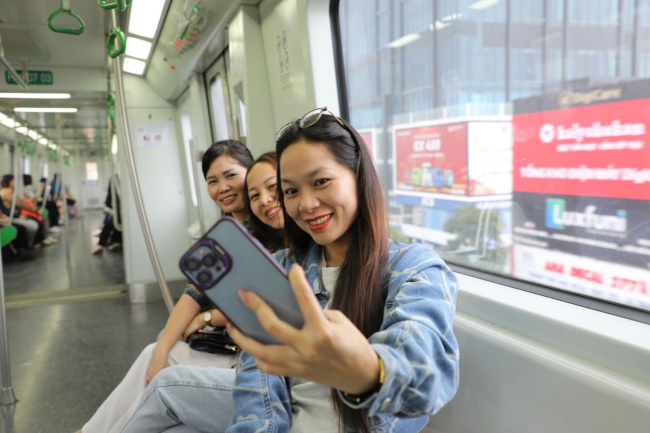 越南當(dāng)?shù)孛癖娫诤觾?nèi)吉靈-河?xùn)|線輕軌車廂里自拍。(人民日報(bào)記者 沈小曉 攝)