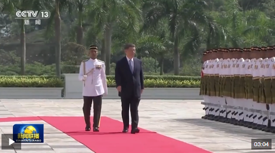 習(xí)近平乘車抵達(dá)時(shí),易卜拉欣和馬來西亞總理安瓦爾在下車處熱情迎接。兩國元首登上檢閱臺,軍樂團(tuán)奏中馬兩國國歌,鳴禮炮21響。習(xí)近平檢閱儀仗隊(duì)。兩國元首進(jìn)入國家王宮大廳,同雙方陪同人員握手致意。