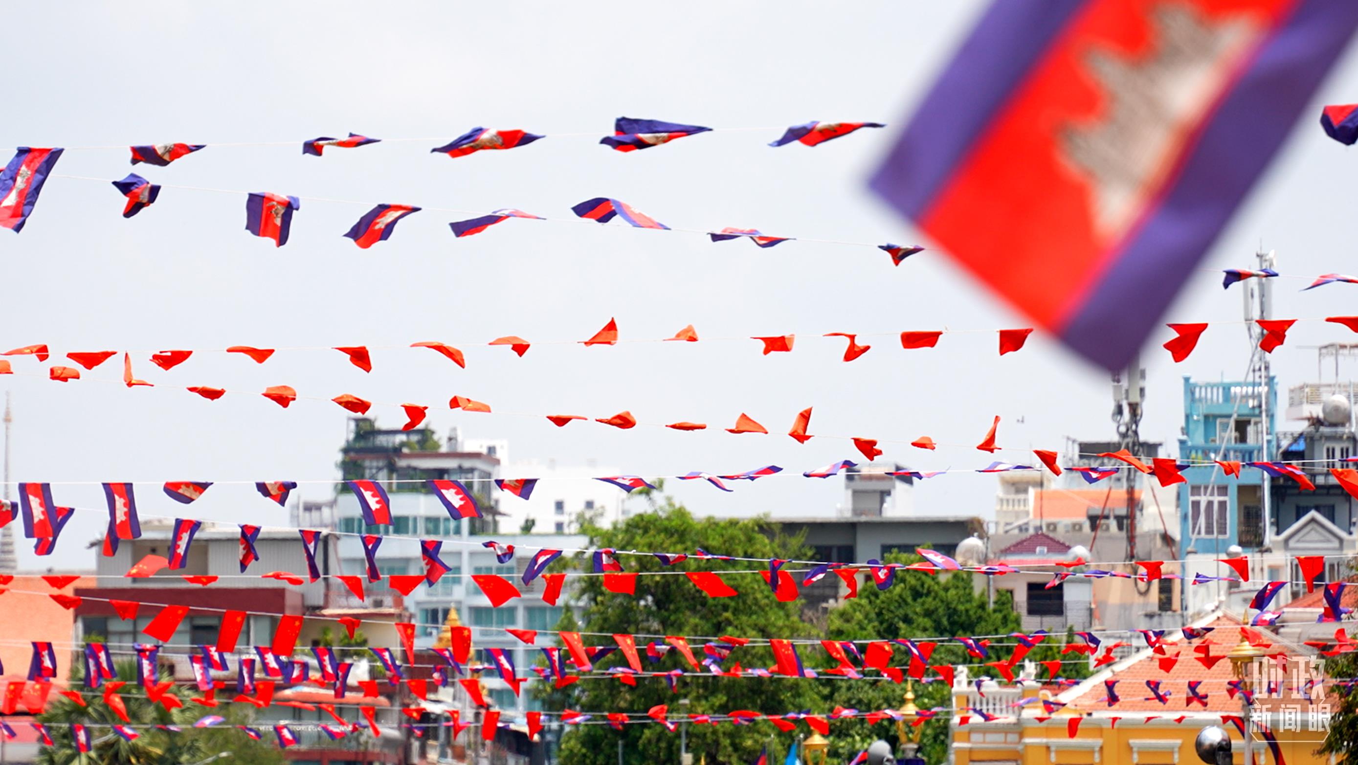金邊街頭懸掛的中柬兩國(guó)國(guó)旗。(總臺(tái)央視記者盧心雨拍攝)